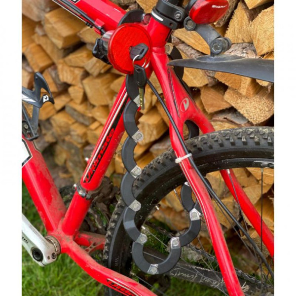 Skládací zámek STAR S810 poskytuje skvělou ochranu kola proti krádeži. O tu se stará ocel o tloušťce 3,5 mm, přes kterou se jen tak nějaký zloděj nedostane. Bezpečnostní skládací zámek se uzamyká prostřednictvím klíče. Součástí balení jsou dva klíče a praktický držák na rám. Skládací zámek S810 je dlouhý 92 cm a lze jej snadno složit do kompaktní podoby.