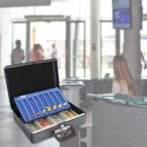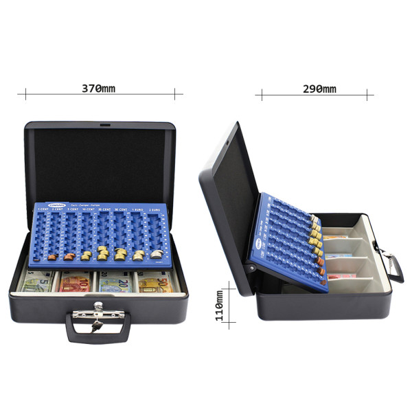 Hlavní výhody: Cylindrický zámek se 2 klíči Možnost použít jako kufřík Plastový mincovník pro euromince Plastové přihrádky pro eurobankovky Horní a boční rukojeť Kvalitní ocelové provedení Objevte přednosti europokladničky, které v sobě spojuje výhody klasické europokladničky a kompaktního kufříku. Uschovejte menší obnos peněz v pokladničce, která se po zavření může používat i jako kufřík. Po otevření europokladničky se automaticky vysune spolu s věkem i plastový mincovník. Disponuje 8 radami pro euromince, od 1 centových až po 2 eurové. Pod mincovníkem se skrývají 4 plastové přihrádky pro eurobankovky. Po zavření víka můžete europokladničku přenášet buď jako kufřík nebo klasicky jako pokladničku za pomoci horní rukojeti.