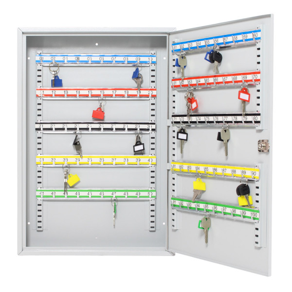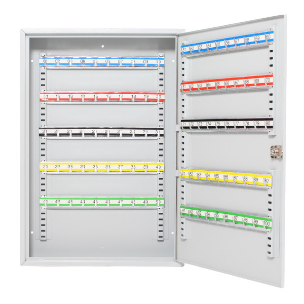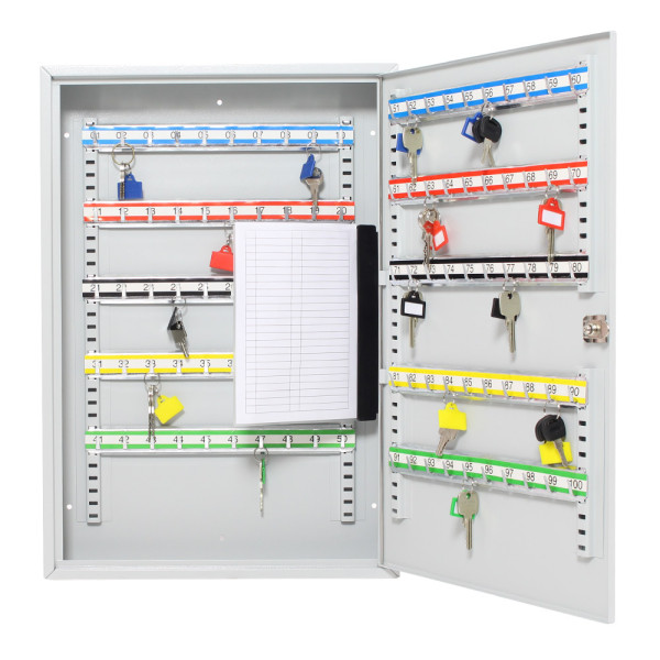Hlavní výhody: Cylindrický zámek se 2 klíči Pozinkované háčky na klíče (100 háčků) Dodávané spolu se 100 visačkami Výškově nastavitelné lišty s háčky Fixní umístění háčků Upevnění na stěnu Kvalitní ocelové provedení Přehledné uspořádání všech vašich klíčů docílíte díky naší skříňce na klíče Rottner S100. Vyrobená z kvalitního ocelového plechu nabízí celkem až 100 pozinkovaných háčků na zavěšení klíčů nebo svazků klíčů. Jednotlivé lišty, na kterých jsou umístěny háčky můžete vertikálně posouvat a přizpůsobit tak aktuálním potřebám. Pro lepší pořádek a evidenci klíčů dodáváme spolu se skříňkou i 100 barevných visaček na klíče. Skříňku jednoduše upevníte na stěnu pomocí přiloženého kotvícího materiálu.