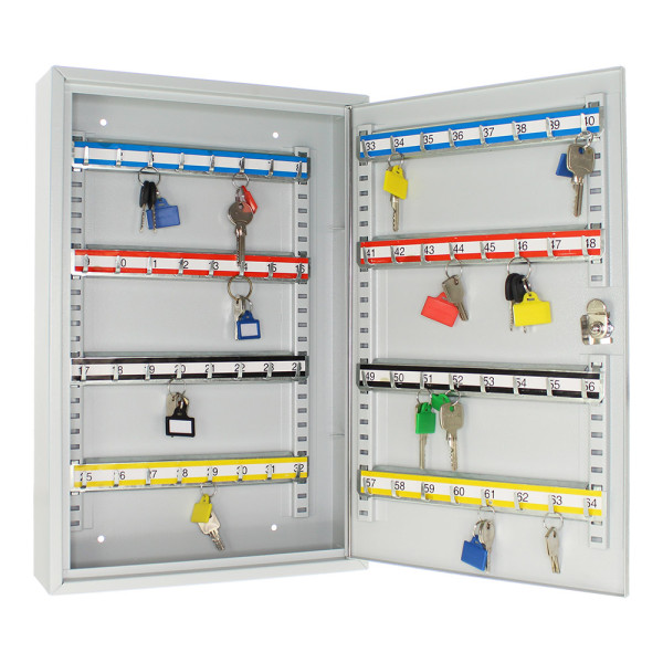 Hlavní výhody: Cylindrický zámek se 2 klíči Pozinkované háčky na klíče (64 háčků) Dodávané spolu se 64 visačkami Výškově nastavitelné lišty s háčky Fixní umístění háčků Upevnění na stěnu Kvalitní ocelové provedení Kvalitní skříňka na klíče S64 disponuje klasickým cylindrickým zámkem dodávaným spolu s 2 klíči. Skříňka má prostor pro uložení celkem 64 klíčů. Klíče je možné zavěsit na pozinkované háčky. Háčky jsou fixně umístěny na lištách, které můžete výškově posouvat v případě potřeby. Kromě skříňky najdete v balení i 64 visaček, abyste klíče snadno odllíšili. Zadní strana skříňky má připravené otvory pro upevnění na stěnu. Materiál k upevnění je součástí balení.