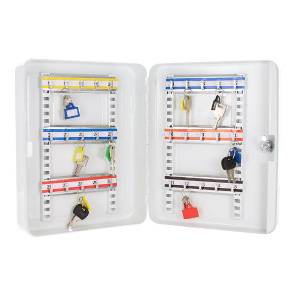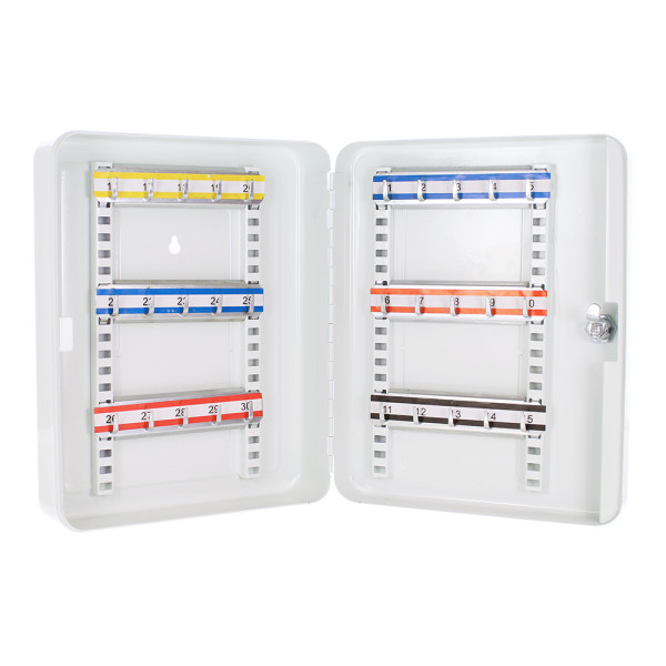 Hlavní výhody: Cylindrický zámek s 2 klíči Prostor pro 30 klíčů Fixně umístěny háčky na lištách Výškově nastavitelný lištý s háčky Kvalitní ocel Kvalitní skříňka na klíč značky Rottner nabízí dostatek prostoru na 30 klíčů, které potřebujete spolehlivě a přehledně uskladnit. Klíče můžete pověsit na háčky, které jsou umístěny na lištách. Lišty lze posouvat vertikálně nahoru a dolů, přičemž háčky na liště jsou fixně připevněny. Pro lepší přehled jsou jednotlivé lišty barevně odlišeny a jednotlivé pozice háčků očíslovány. Kromě skříňky na klíče najdete v balení materiál pro připevnění skříňky na stěnu.