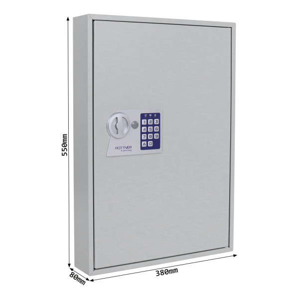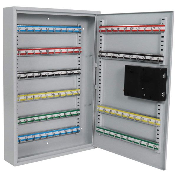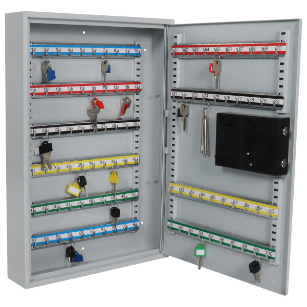 Hlavní výhody: Elektronický zámek Napájení 4 x 1,5V AA bateriemi (nejsou součástí balení) Pozinkované háčky na klíče (100 háčků) Dodávané spolu s 100 visačkami Výškově nastavitelná lišta s háčky Fixně umístěny háčky na lištách Mechanické nouzové otevírání s cylindrickým zámkem a 2 klíči Upevnění na stěnu Šedá skříňka na klíče z kvalitního ocelového plechu nabízí bezpečné a přehledné uložení všech vašich klíčů. Klíče jsou po uložení chráněny elektronickým zámkem, který je napájen čtveřicí 1,5V AA baterii. Přehledná klávesnice poskytuje pomocí LED diod okamžitou odezvu při zadávání kódu. Uvnitř skříňky se nacházejí výškově posuvné lišty, které mají na sobě fixně umístěny háčky. Háčky jsou pozinkované a dohromady jich je přesně 100, což odpovídá prostoru pro 100 klíčů. Jednotlivé lišty jsou barevně rozlišeny a každý háček má své číslo. Archivace klíčů je tak velmi jednoduchá a přehledná. V balení naleznete barevné visačky a také materiál na upevnění.