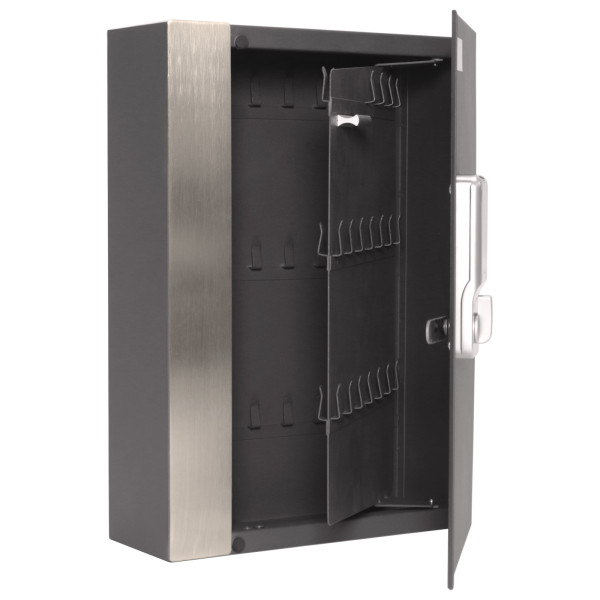 Hlavní výhody: Elektronický zámek Napájení 4 x 1,5V bateriemi (nejsou součástí balení) Celkově 68 háčků Jednoplášťový korpus Pevný umístěna lišta s háčkem Pozinkovaný korpus Skříňka na klíče s modelovým označením Key Home 68 disponuje elektronickým zámkem. Zámek spolu s klávesnicí pro zadávání kódu jsou napájeny 4 x 1,5V bateriemi (nejsou součástí balení). Uvnitř se nacházejí fixně umístěny lišty s celkově 68 pozinkovanými háčky, na které si můžete uložit klíče. Skříňka má standardní jednoplášťový korpus a dveře lze otevřít do úhlu 90°. Zadní strana má připravené otvory na upevnění. Materiál na upevnění je součástí balení.
