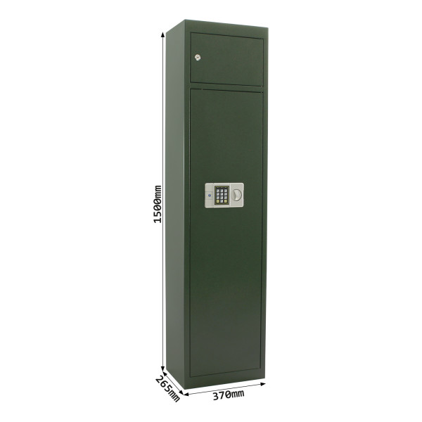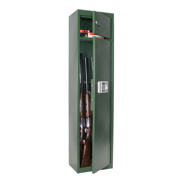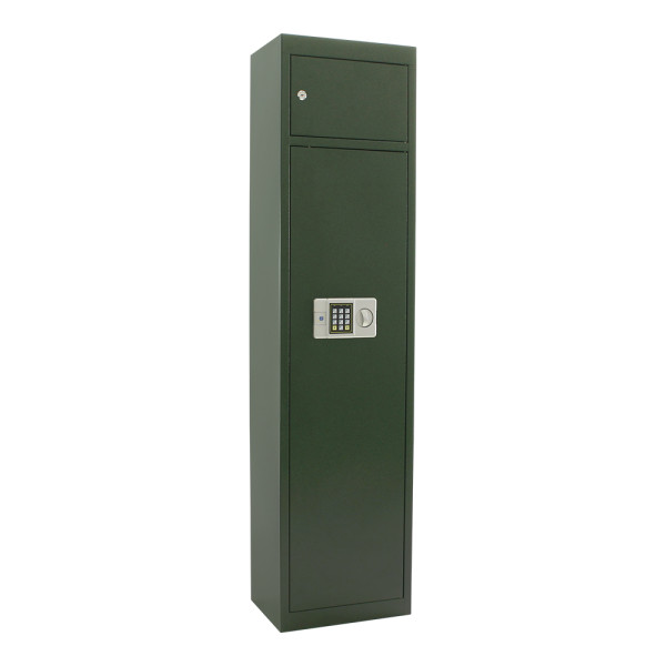Hlavní výhody: Elektronický zámek s 2 klíči Prostor pro 5 dlouhých zbraní Napájení 4 x 1,5V AA baterií (není součástí balení) Kvalitní povrchová úprava Jednoplášťová skříň Vnitřní schránka s cylindrickým zámkem a 2 klíči Mechanické nouzové otevírání s cylindrickým zámkem a 2 klíči Klasickou skříň na zbraně jsme vylepšili bezpečným elektronickým zámkem, ke kterému dodáváme i 2 nouzové klíče. Zámek je napájen klasickými 1,5V AA bateriemi. Dovnitř se vejde 5 dlouhých zbraní, které tak budou vhodně chráněny před nechtěným použitím neoprávněnou osobou. Kromě držáků na zbraně a držáku na čisticí potřeby pro zbraně na vnitřní straně dveří se uvnitř skříně nachází i menší schránka. Schránku lze samostatně uzamknout některým z 2 přiložených klíčů. Otvory na zadní straně slouží pro připevnění na stěnu. Potřebný kotvící materiál je součástí dodávky. Tato skříň není certifikována. Pro tuto schránku na zbraně je stanoveno, že při přechovávání dlouhých zbraní do počtu 2 ks nebo do 500 ks nábojů plati prohlášení o shodě.
