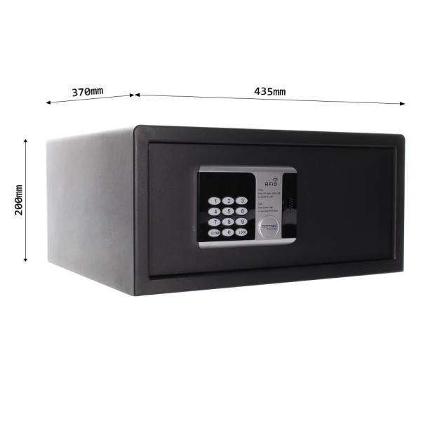Hlavní výhody: Elektronický zámek s 2 klíči Možnost otevřít bankovní karty nebo jinou RFID kartou Možnost otevřít i zadáním klasického kódu Vhodný sejf i pro uložení notebooku Napájení 4 x 1,5V AA bateriemi (nejsou současti balení) Posledních 100 přístupů uložených v paměti Jednoplášťový sejf s tloušťkou korpusu 1,5 mm Osvětlený interiér Mechanické nouzové otevírání s cylindrickým zámkem a 2 klíči Otvory na ukotvení na spodní a zadní straně Moderní nábytkový sejf nabízí kromě klasického elektronického zámku se zadáváním hesla i možnost otevření prostřednictvím kreditní karty nebo jiné karty s RFID čipem. Udělejte tak ráznému konci různým klíčem nebo zdlouhavým, těžko zapamatovatelným heslům. Napájení je řešeno klasickým způsobem, a to 1,5V bateriemi. V případě potřeby je možné vypnout zobrazování číslic na displeji. Vnitřní paměť sejfu registruje posledních 100 otevření a zavření. Uvnitř sejfu je dostatek prostoru pro uložení notebooku a najdete tam i vnitřní osvětlení. Sejf ukotvíte pomocí připravených otvorů na spodní a zadní straně. Kotvící materiál je součástí balení. Kování zvyšuje celkovou vnější hloubku sejfu o 15 mm.