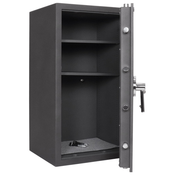 Hlavní výhody: Standardní trezorový zámek s 2 klíči Bezpečnostní třída I (ČSN EN 1143-1) Trezor má dvouplášťové dveře s tloušťkou 12 mm Dveře trezoru lze otevřít v úhlu 90° Rozvorový uzamykací mechanizmus zajistí uzamčení na 3 stranách Dodávané s 2 vyjímatelnými poličkami Otvory na ukotvení na spodní a zadní straně trezoru S pořádným trezorem s bezpečnostní třídou I (ČSN EN 1143-1) a kvalitním trezorovým zámkem budou vaše důležité dokumenty, šanony, cennosti, cestovní doklady a jiné důležité věci bezpečně chráněny. K tomu přidejte dvouplášťové dveře s tloušťce 12 mm a o uschovány věci už nemusíte mít žádné obavy. Přístup do vnitřku trezoru je bezproblémový i díky otevírání dveří do úhlu 90°. Trezor je dodáván s 2 vyjímatelnými poličkami, s nimiž tak vnitřní prostor dostane více variability. Připravené otvory na spodní a zadní straně umožní bezproblémové ukotvení. Kotvící materiál je součástí balení. Kování zámku zvyšuje celkovou vnější hloubku trezoru o 15 mm.