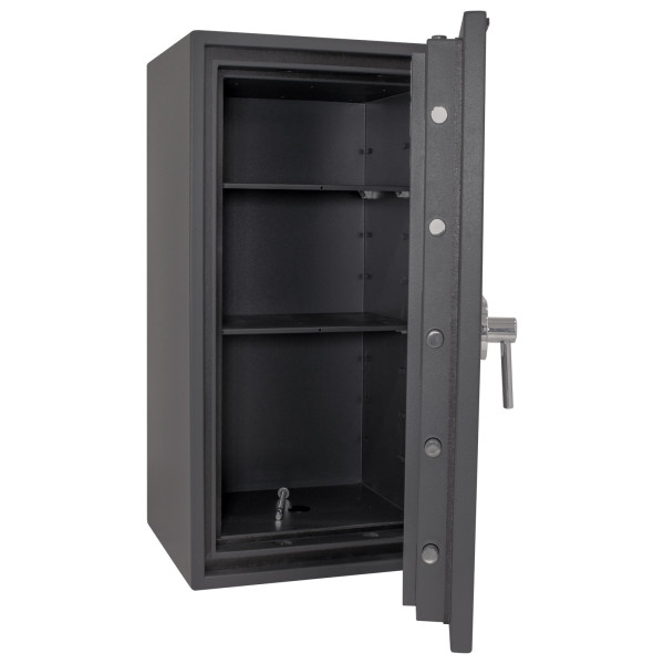 Hlavní výhody: Certifikovaný elektronický zámek Bezpečnostní třída I (ČSN EN 1143-1) Ohnivzdornost po dobu 60 minut pro papír Napájení 1 x 9V baterií (není součástí balení) Možnost úschovy i zbraní a munice podle č. 190/2003 Sb. z. 3-stranný uzamykací mechanizmus Betonová výplň mezi plášti trezoru Otevření dveří až do 180° Polička uvnitř Možnost doobjednání teleskopických polic Možnost doobjednání teleskopické registratury Elektronické nouzové otevírání externí baterií Otvory na ukotvení na spodní straně trezoru Antracitový nábytkový trezor nabízí certifikovaný elektronický zámek s vnějšími kontakty pro přiložení náhradní baterie v případě vybití té původní. Zároveň trezor disponuje bezpečnostní třídou I (ČSN EN 1143-1) a ohnivzdornými vlastnostmi, které uložené věci ochrání až po dobu 60 minut. Dovnitř trezoru je možné kromě klasických věcí uložit i krátké zbraně a munici. Napájení elektronického zámku je řešeno prostřednictvím 9V baterie. Trezor mezi plášti disponuje speciální betonovou výplní, která pomáhá jeho odolnosti proti ohni. Dveře lze otevřít až do úhlu 180° a uzamkne se pomocí 3-stranného uzamykacího mechanismu. Uvnitř trezoru je poličky a je možné doobjednat i doplňkovou výbavu. Spodní strana má otvory pro ukotvení. Kotvící materiál je součástí balení. Kování zvyšuje celkovou vnější hloubku trezoru o 60 mm.