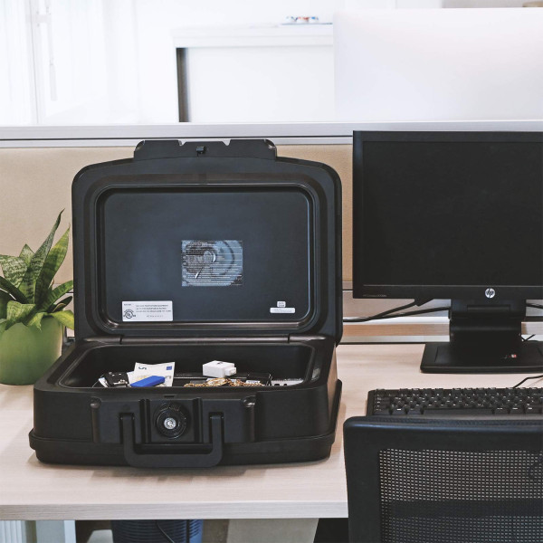Hlavní výhody: Cylindrický zámek se 2 klíči Ohnivzdornost po dobu 30 minut pro dokumenty při max. teplotě 843 °C (UL testováno - vnitřní teplota zůstává nižší než 177 °C) Praktická rukojeť pro přenos Kvalitní plastové provedení Černý box z modelové řady Fire Data disponuje klasickým cylindrickým zámkem dodávaným spolu s 2 klíči. Box Fire Data 2 je ohnivzdorný, a to až po dobu 30 minut pro papírové dokumenty (testováno při teplotě 843 °C). Uložené věci v boxu můžete jednoduše přenášet díky vestavěné výklopné rukojeti. Box ale není vodotěsný. Při častém přenášení potěší kvalitní plastové provedení, které odolá i náročnějšímu zacházení. Pro tuto schránku na zbraně je stanoveno, že při přechovávání krátkých zbraní do počtu 2 ks nebo do 500 ks nábojů plati prohlášení o shodě.